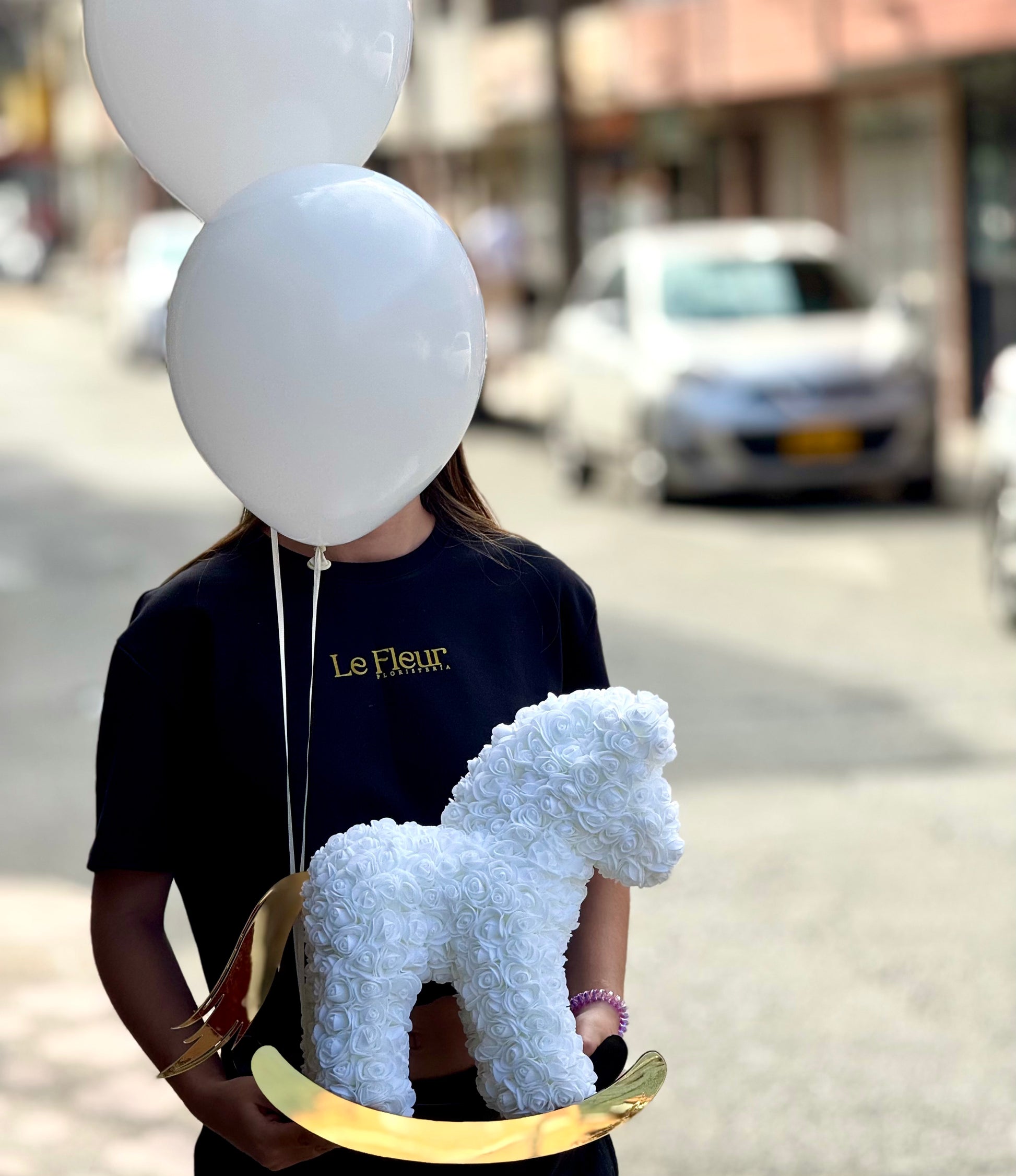 Caballo 40 Cm Blanco🐴 De Rosas , Base Acrilica y 2 Globos Hechos a Mano + tarjeta con el mensajito a tu gusto .