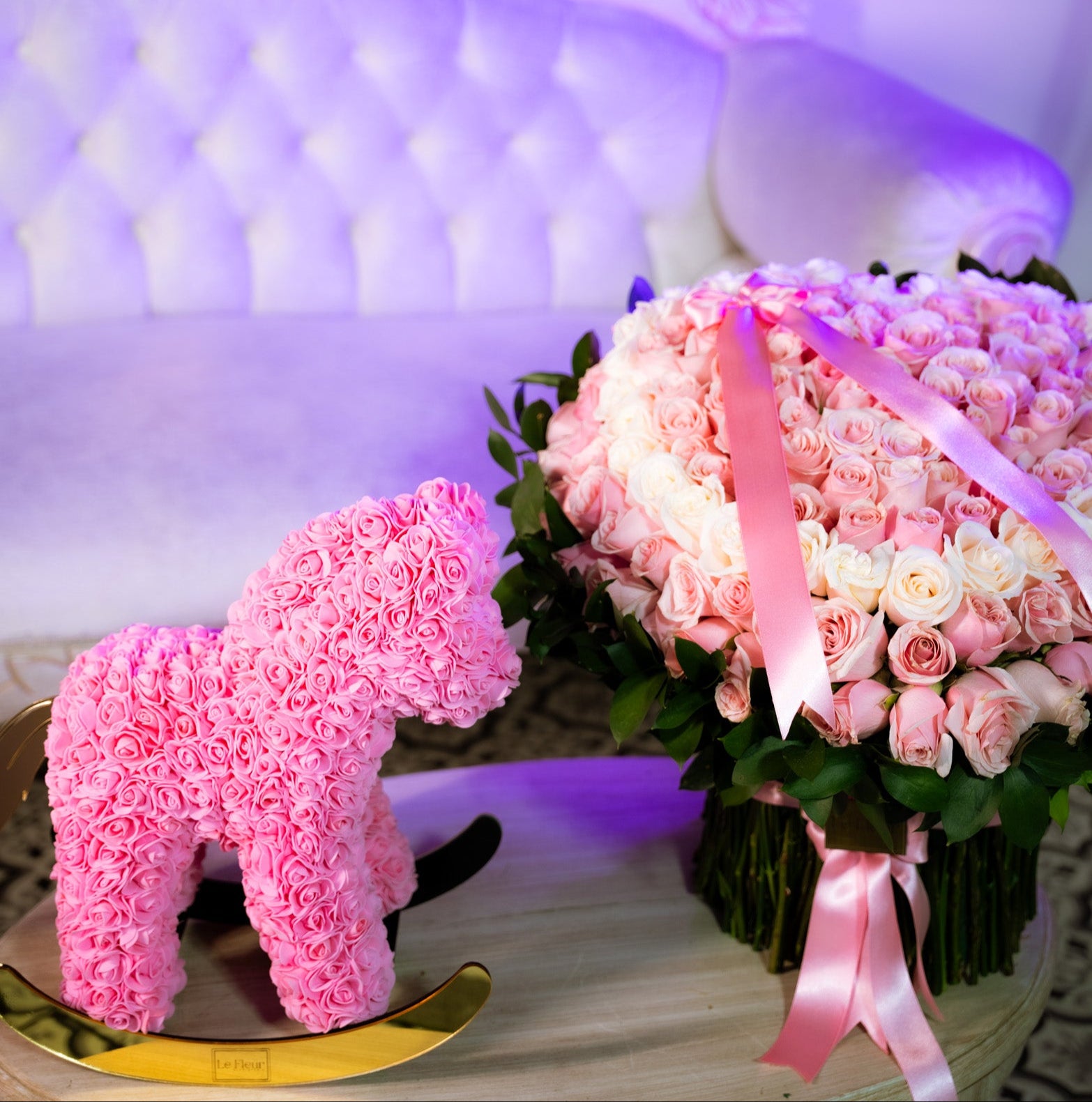 Caballo 40 Cm Rosado🐴 De Rosas , Base Acrilica y 2 Globos Hechos a Mano + tarjeta con el mensajito a tu gusto .