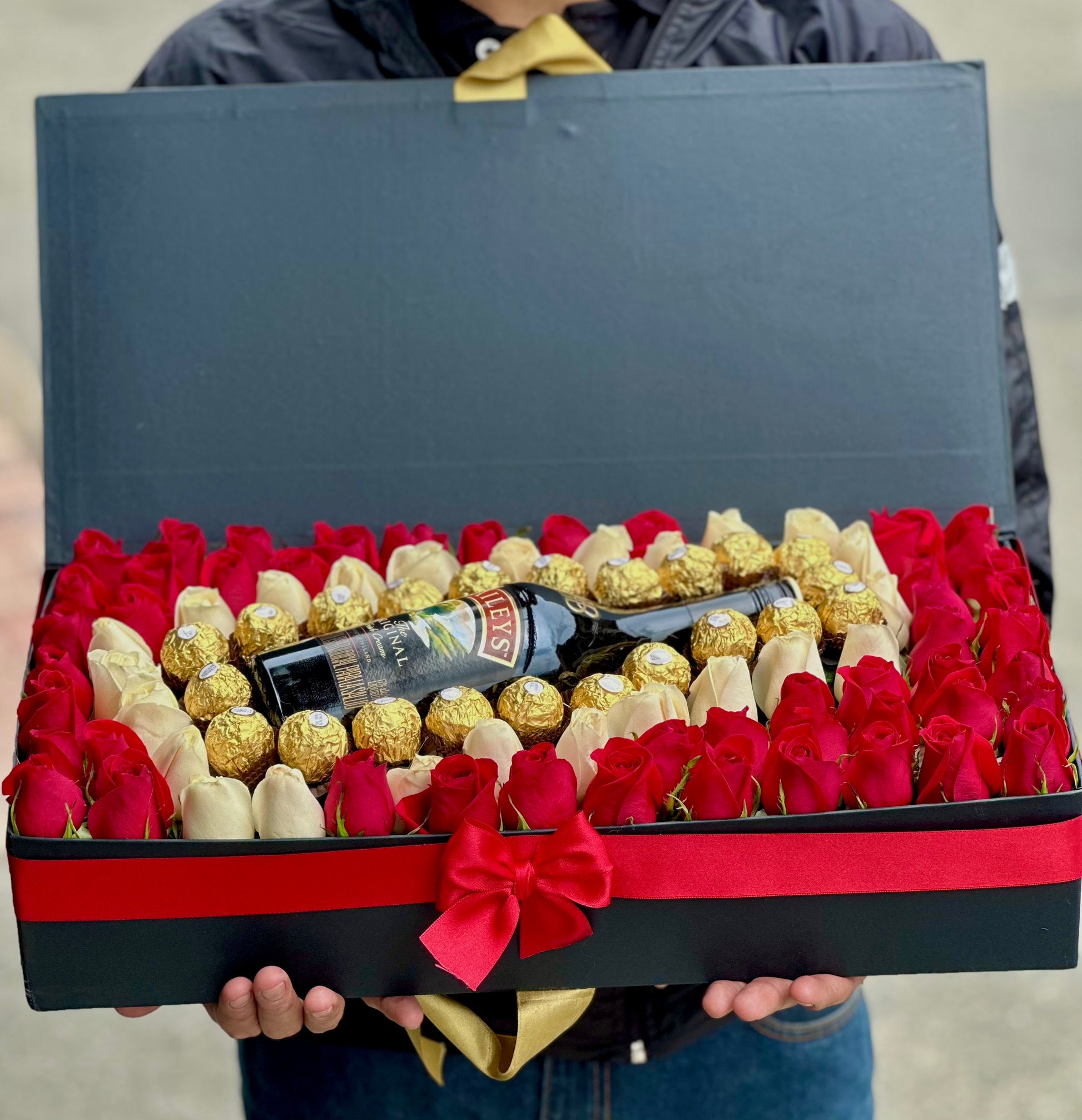 Arreglo floral en caja con forma rectangular con 80 Rosas 🌹 de exportación 🇨🇴 + Botella De Baileys🍾 + 21 Ferrero 🍫 + tarjeta con mensaje a tu gusto .