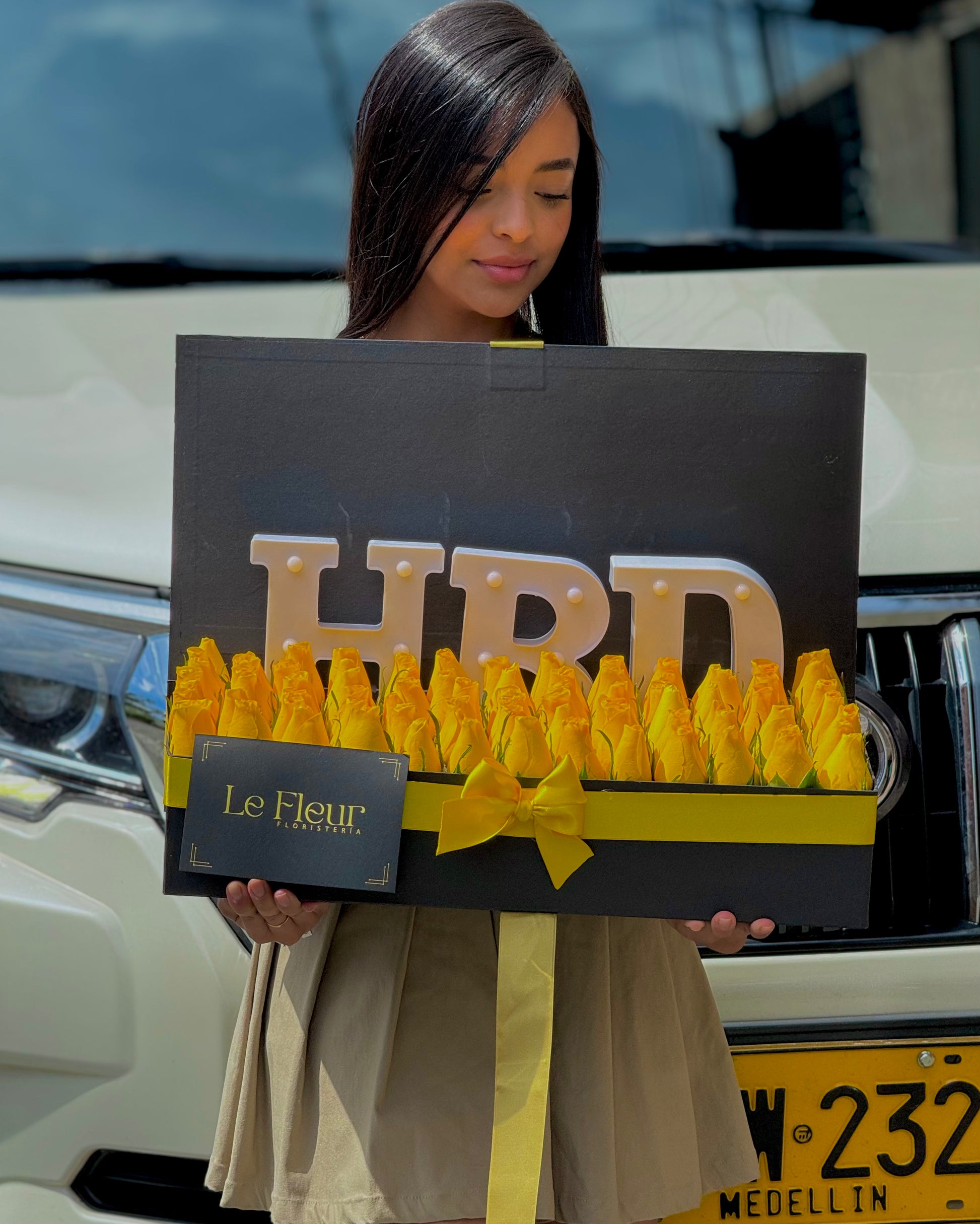 Arreglo floral en caja con forma rectangular con 90 Rosas 🌹 de exportación 🇨🇴 +HBD en led + tarjeta con mensaje a tu gusto .