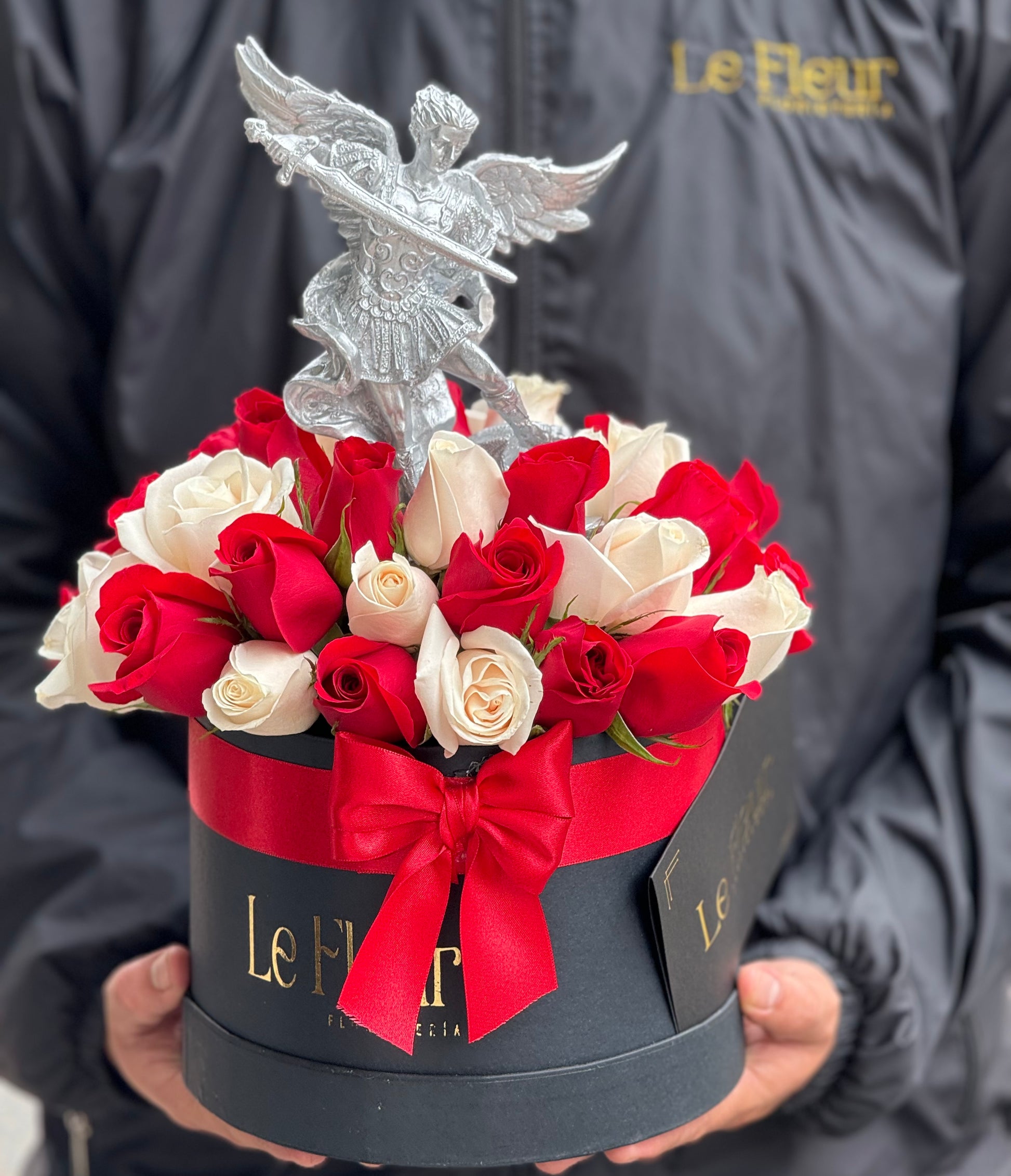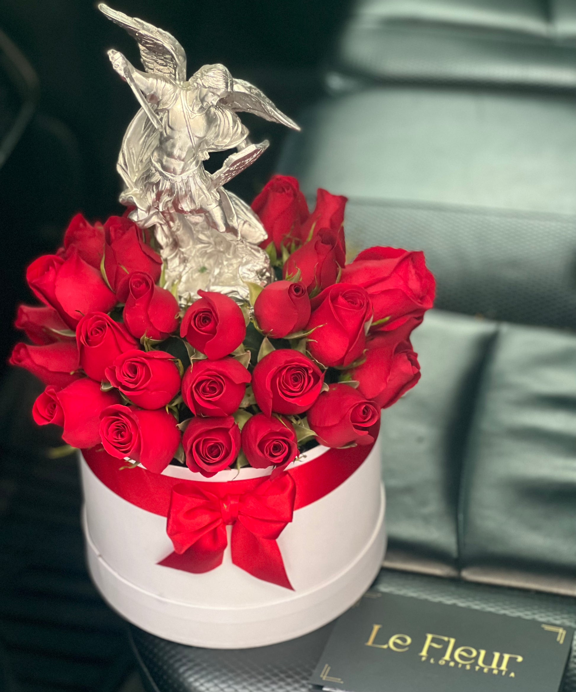 Arreglo floral en caja con forma de cilindro con 30 Rosas 🌹 de exportación 🇨🇴 + Santo + tarjeta con mensaje a tu gusto .
