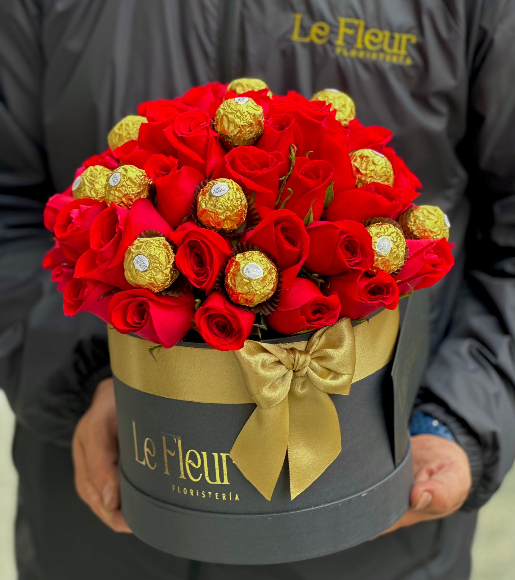 Arreglo floral en caja con forma de cilindro con 65 Rosas 🌹 de exportación 🇨🇴 + 6 Ferrero 🍫 + tarjeta con mensaje a tu gusto .