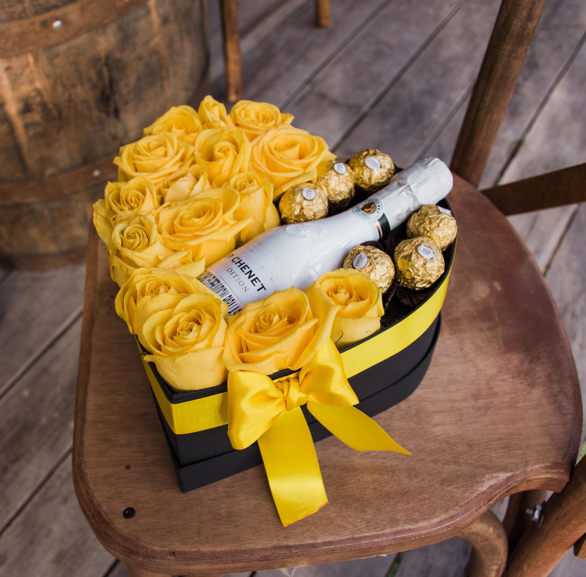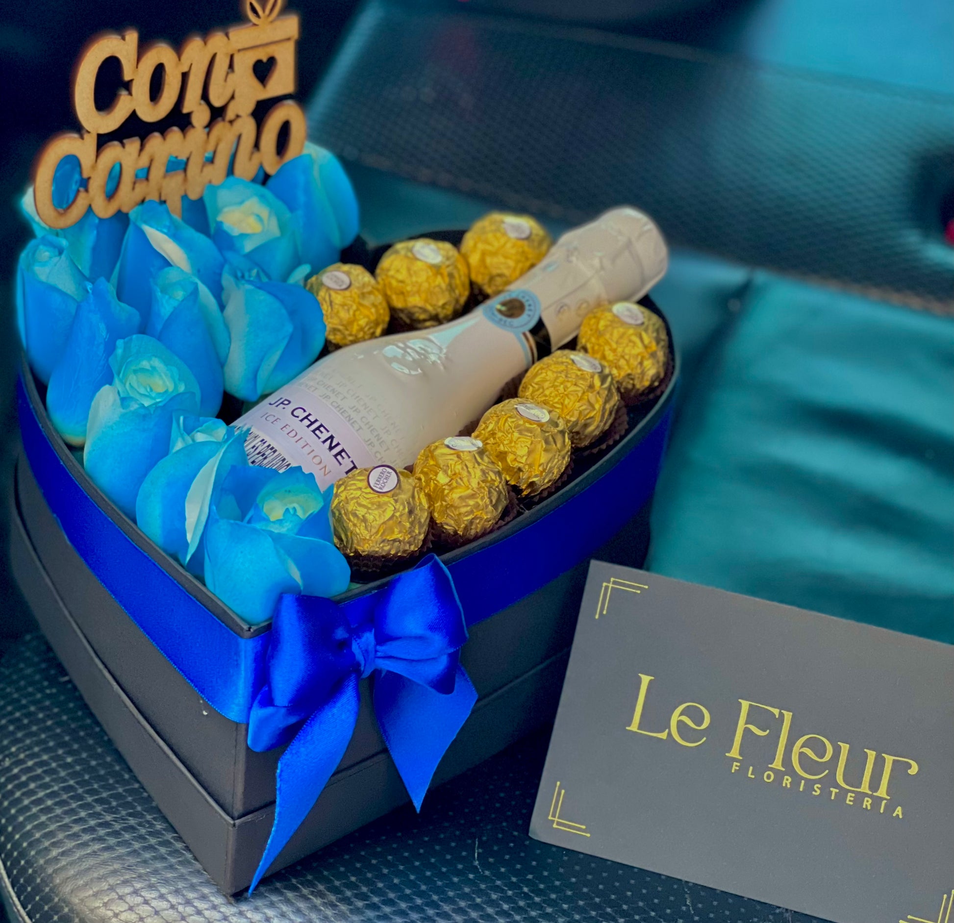 Arreglo floral en caja con forma de corazon con 15 Rosas 🌹 de exportación 🇨🇴 + 6 chocolates 🍫 + Jp Chanet 200 ml 🍾 + tarjeta con mensaje a tu gusto .