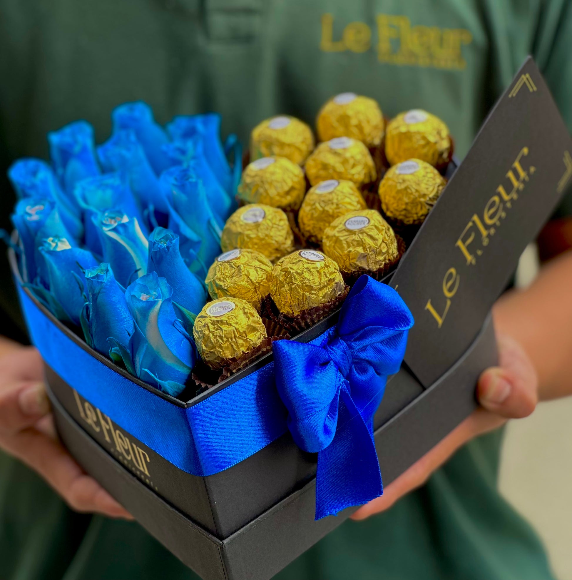 Arreglo floral en caja de forma de corazon con 15 Rosas de exportación + 12 Ferrero Rosher + tarjeta con mensaje a tu gusto
