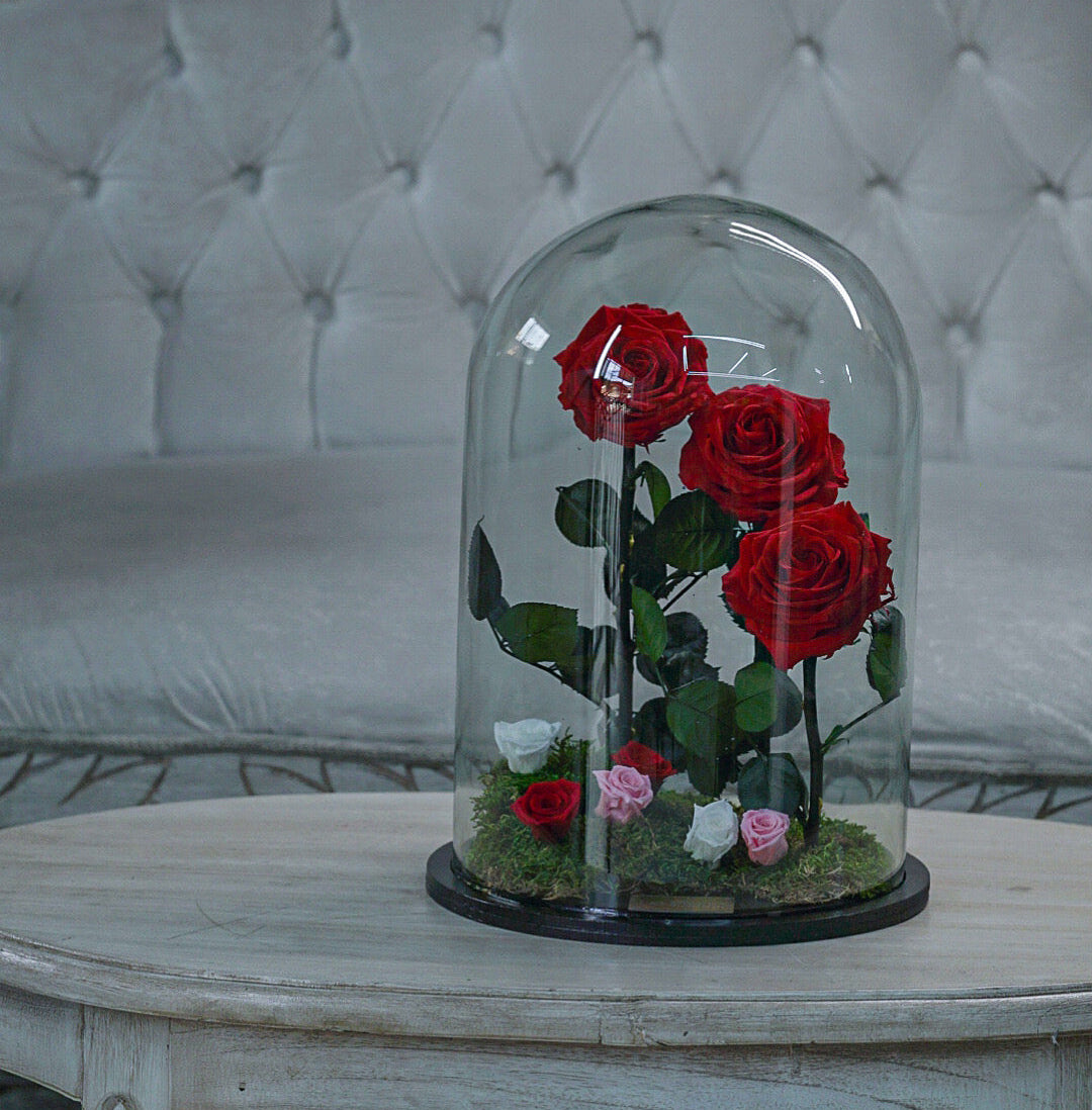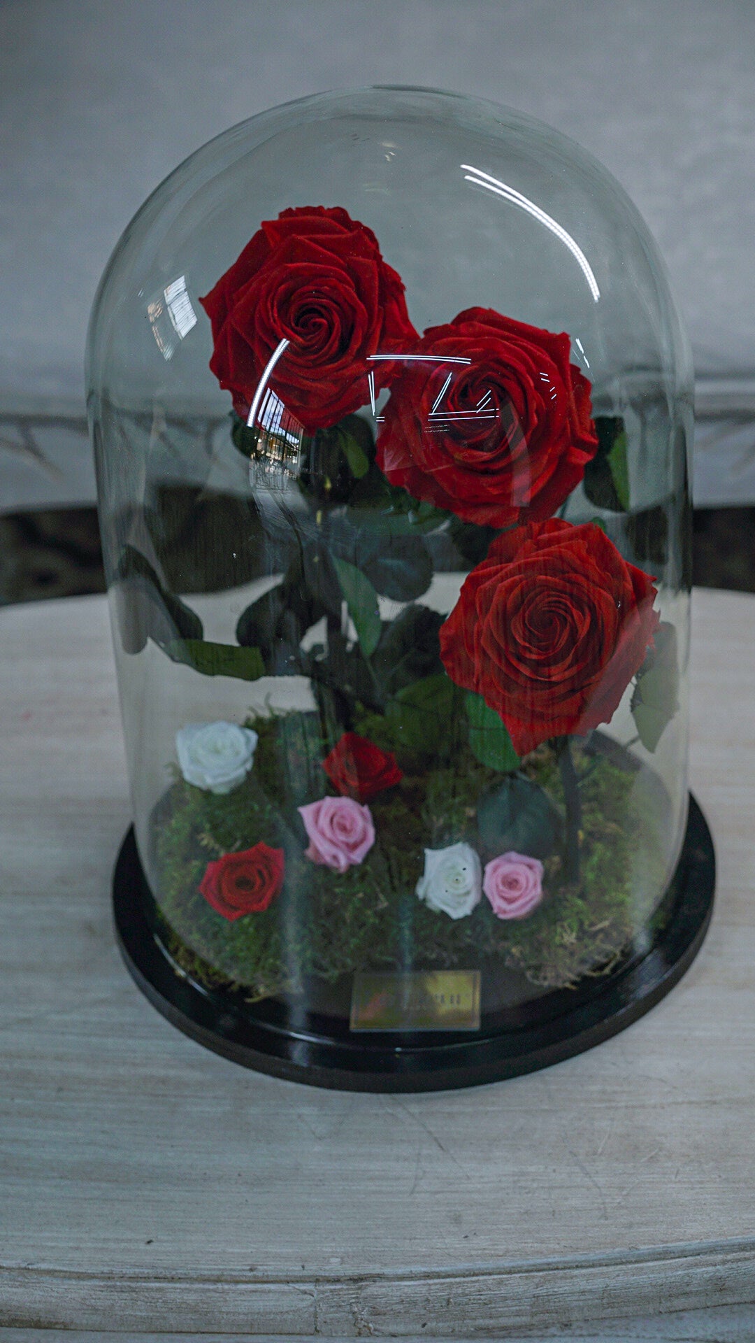 Jardín Preservado Encantado 🌹 cuentan con base de madera , urna de vidrio ,3 rosas preservadas premiun ,6 rosas baby, musgo preservado con una duración de 5 años.