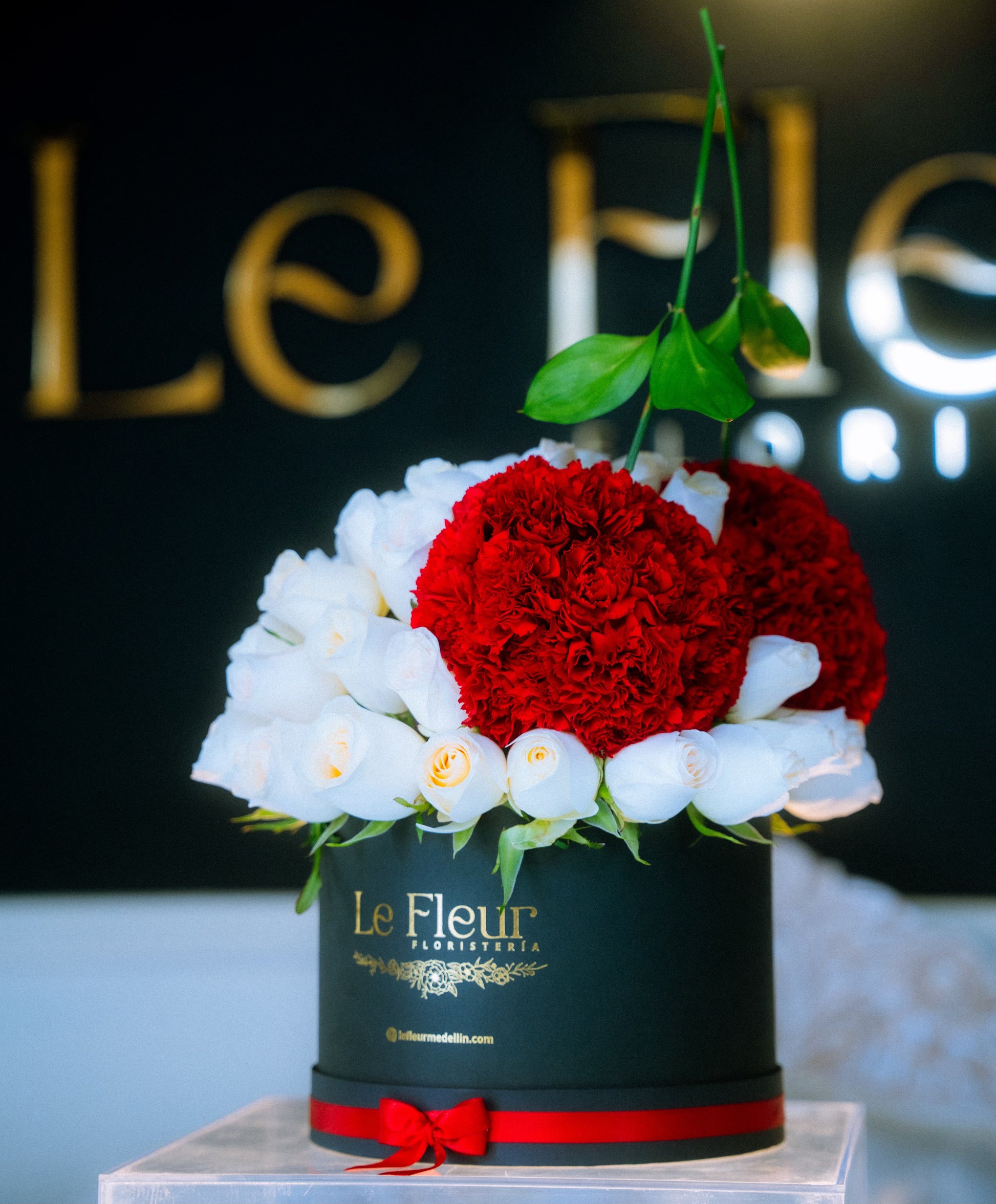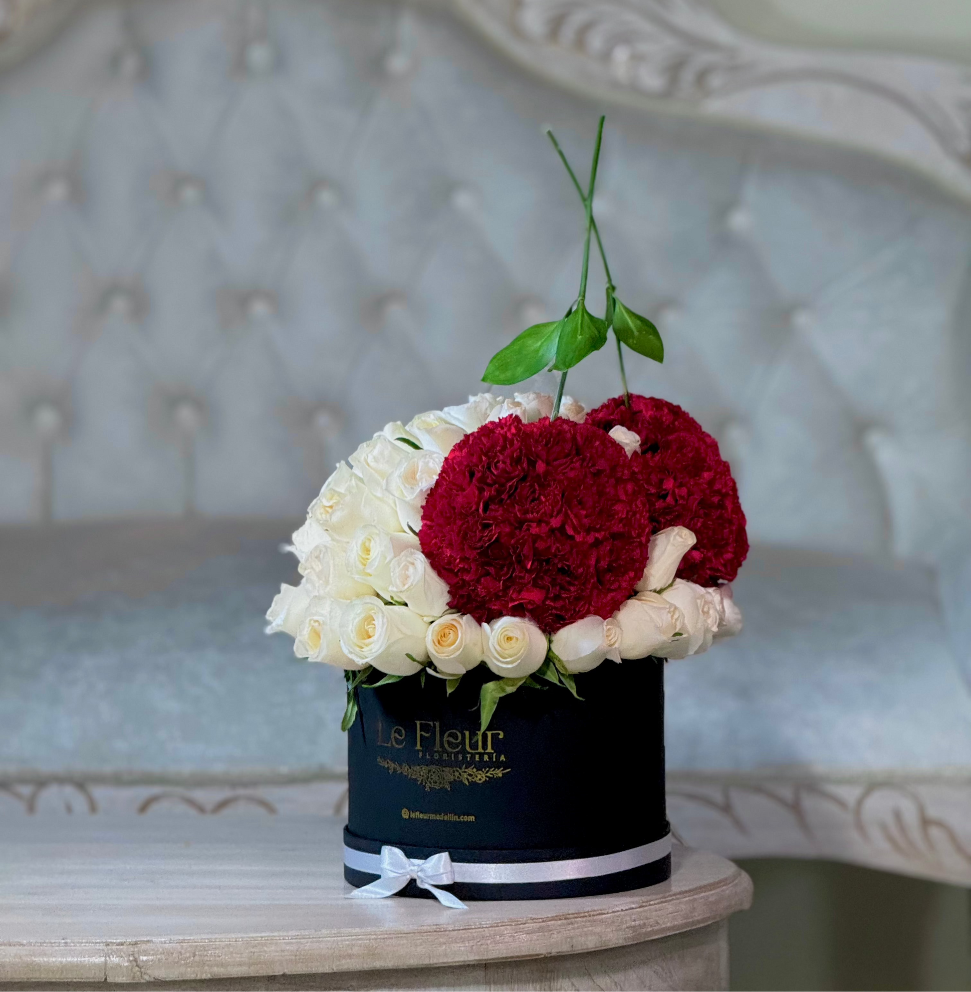 Arreglo floral en caja con forma de cilindro con 65 Rosas 🌹 de exportación 🇨🇴 + 2 Cherris 🍒 + tarjeta con mensaje a tu gusto .