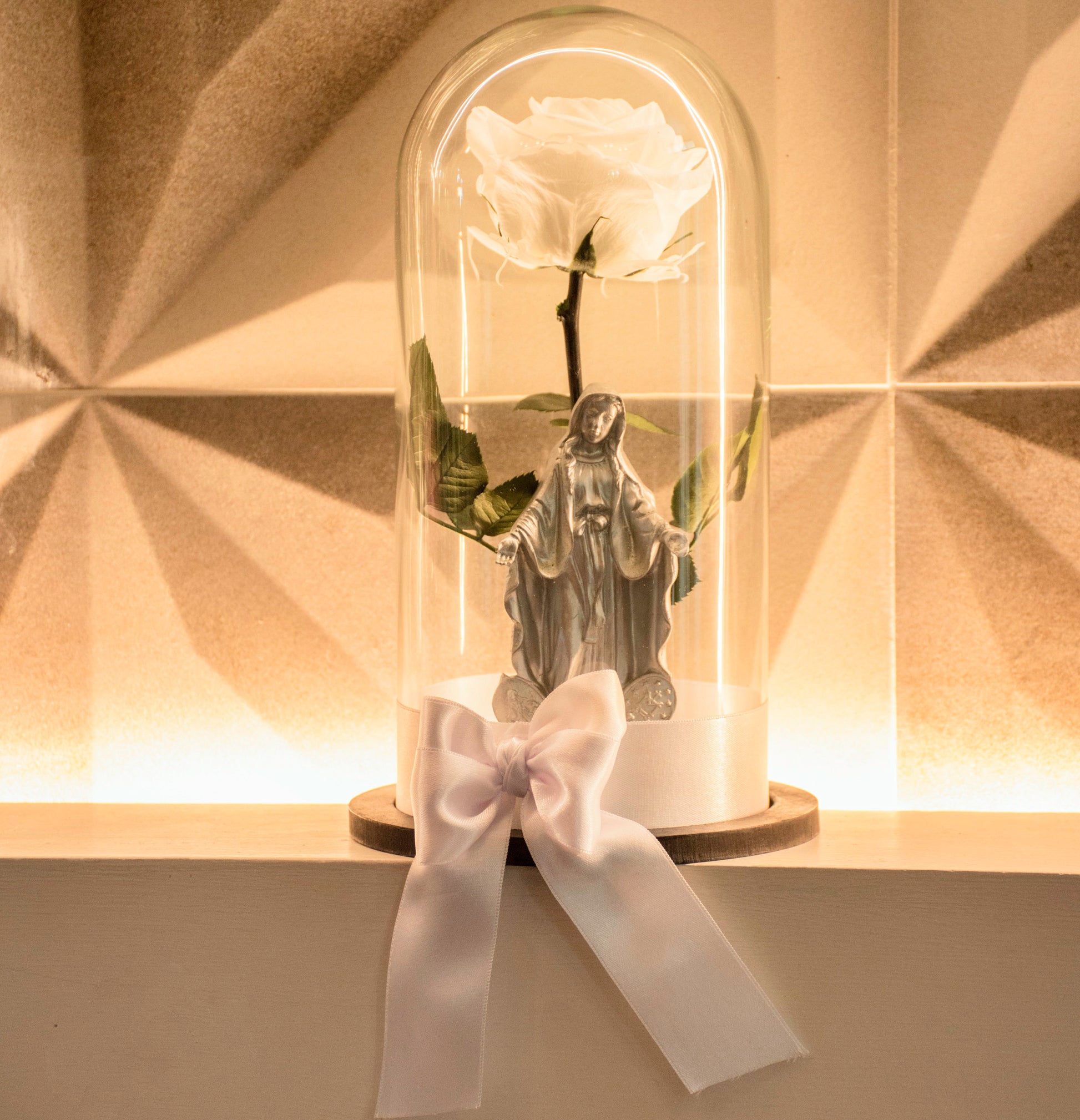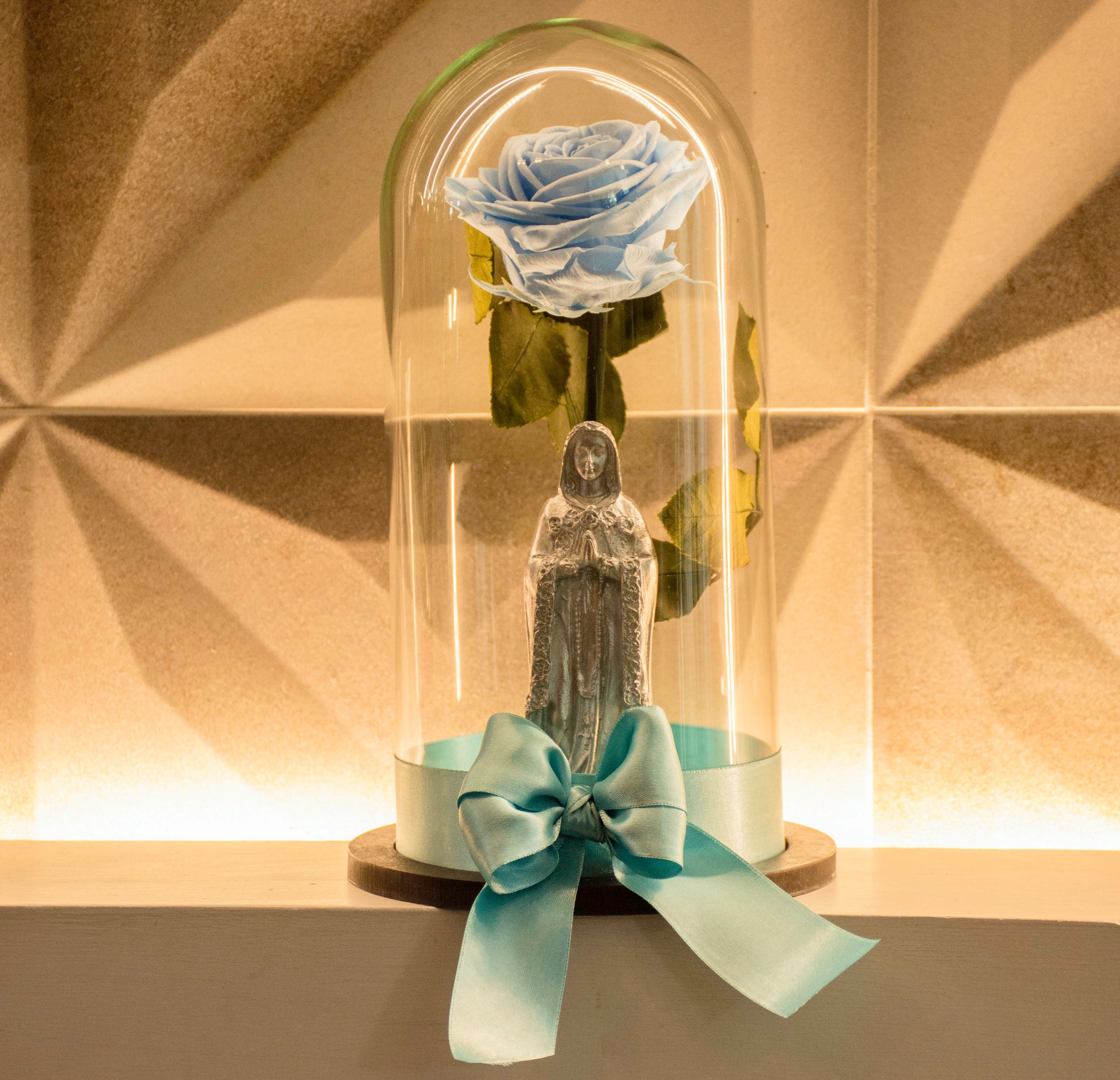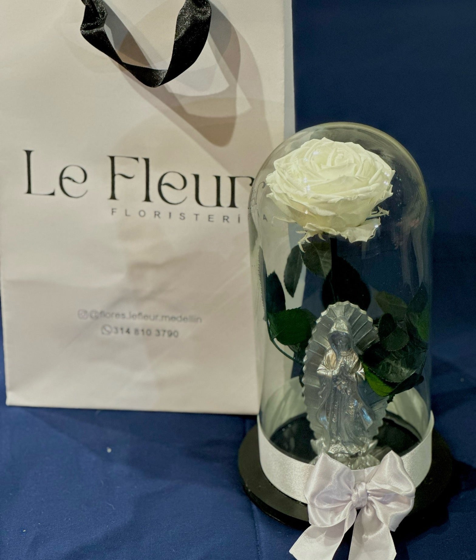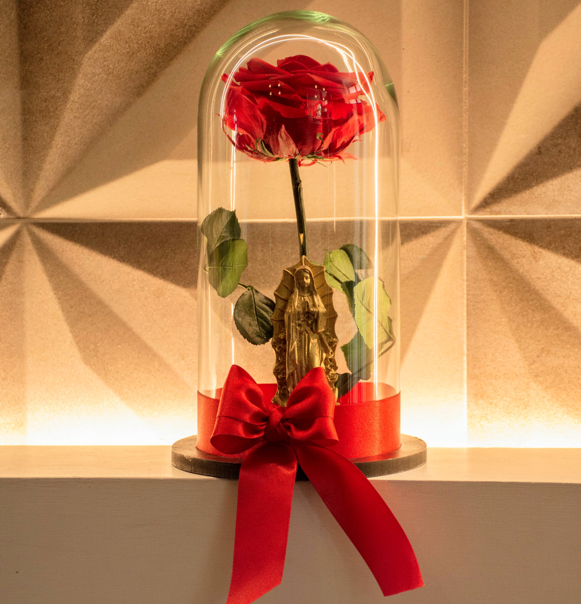 Rosa Preservada 🌹+ Virgen tamaño premiun con una duracion de 5 años + tarjeta con mensaje