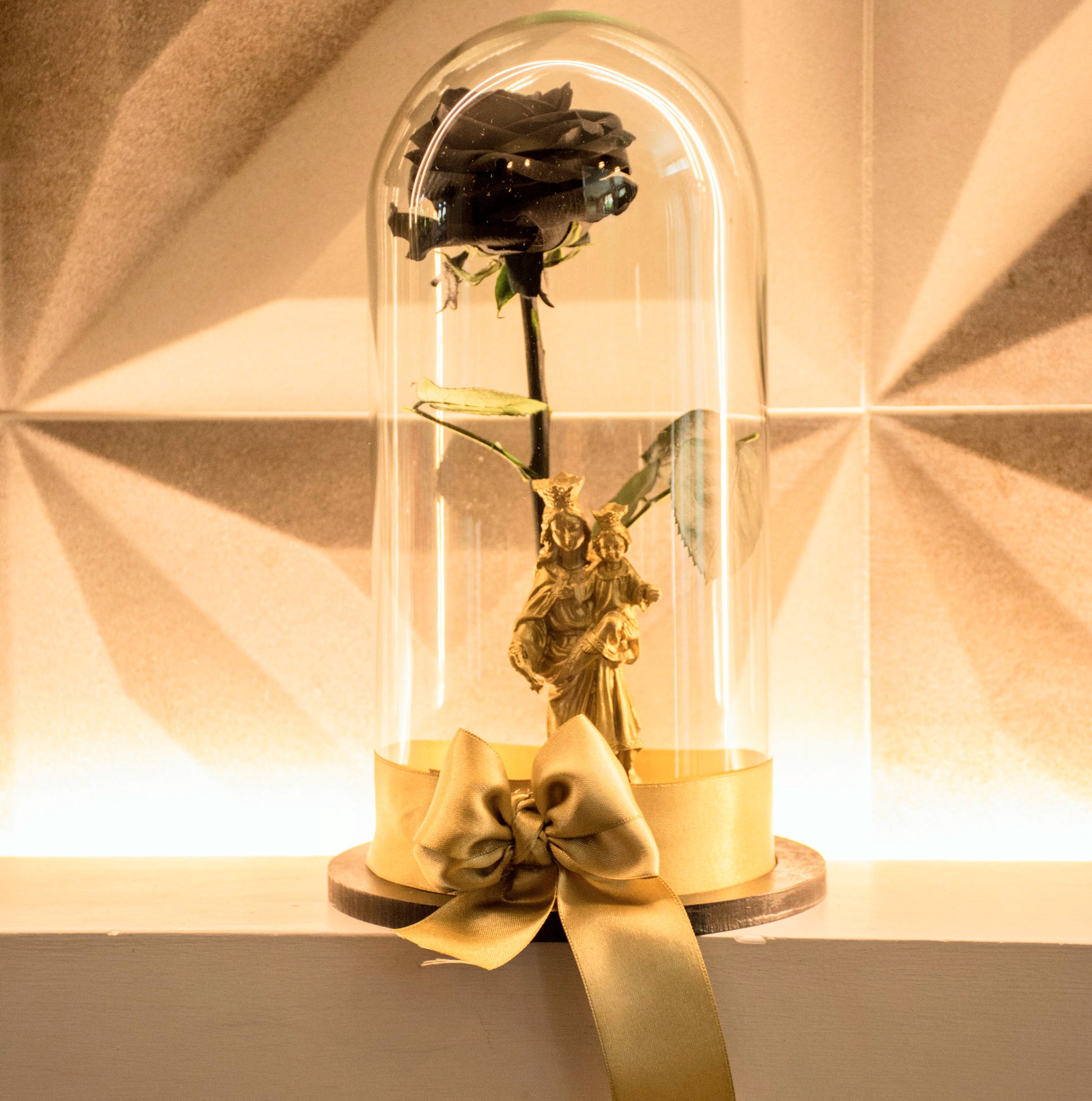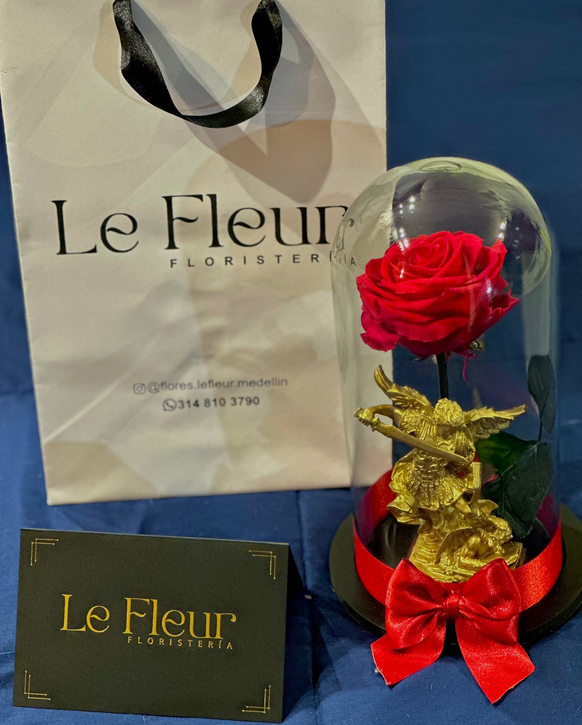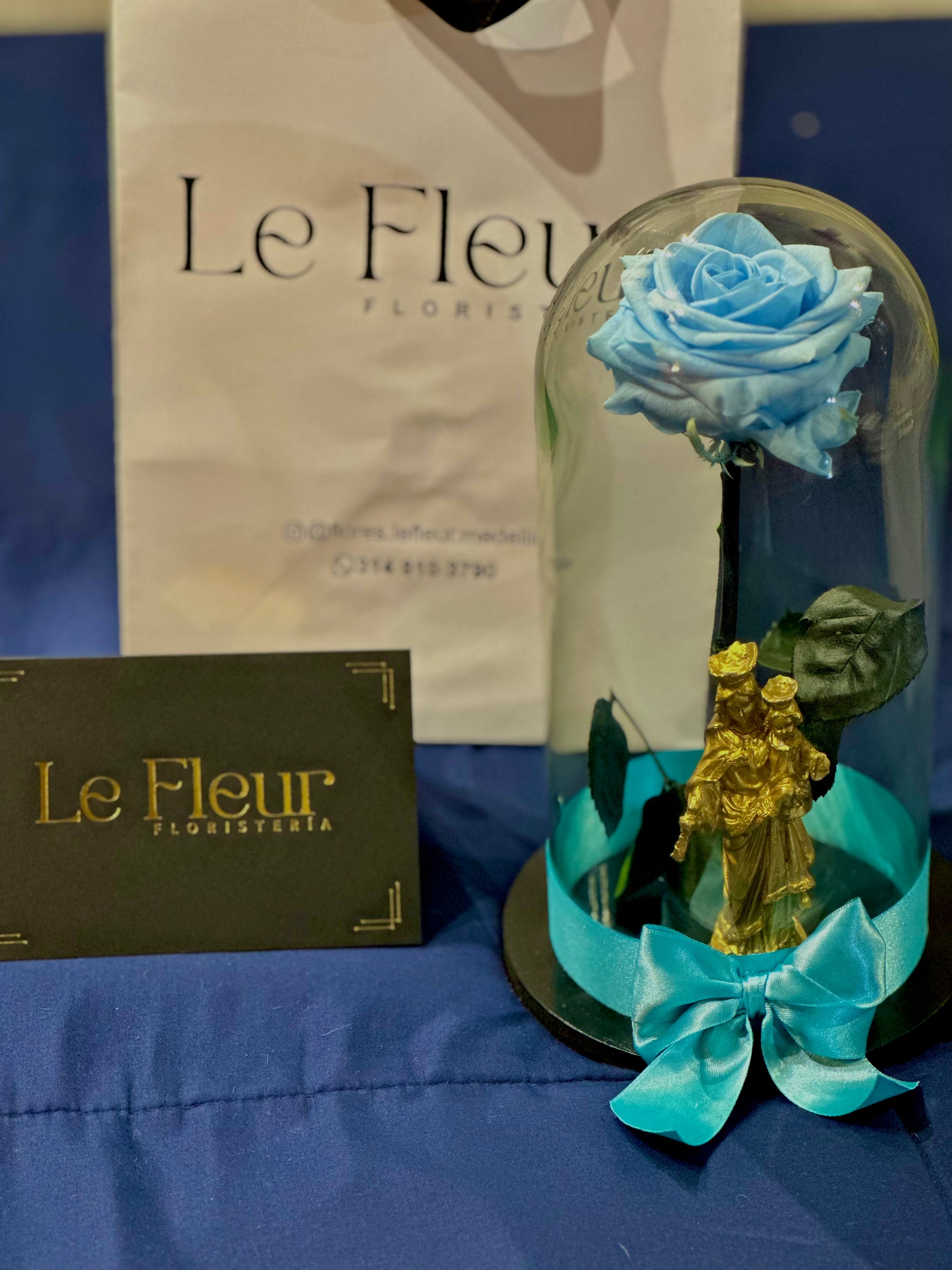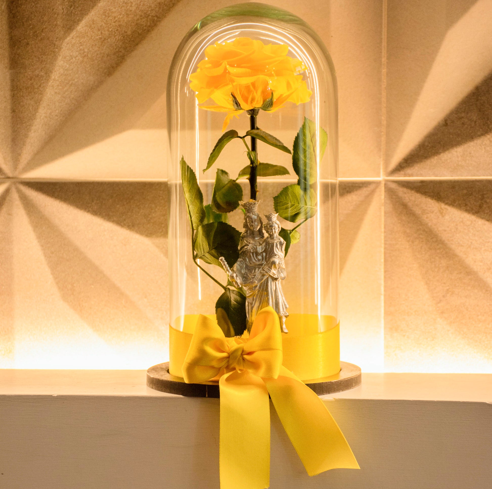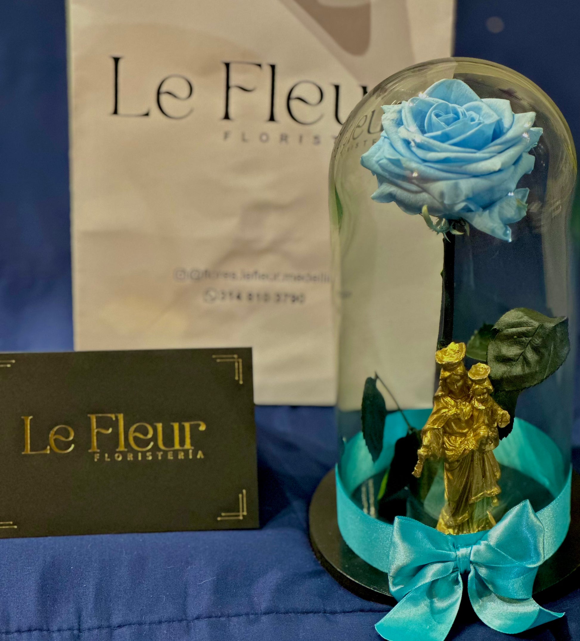 Rosa Preservada 🌹+ Virgen tamaño premiun con una duracion de 5 años + tarjeta con mensaje