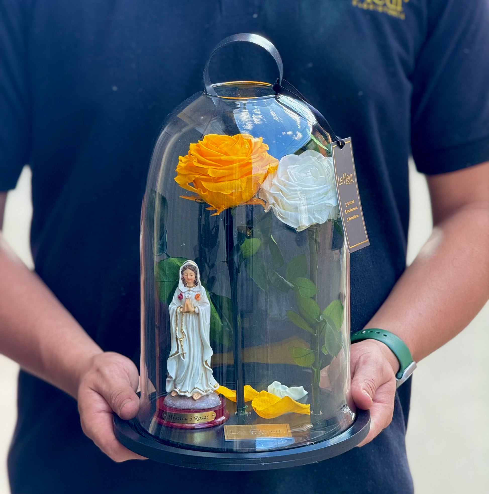 Rosa Preservada Doble XL Amarilla y Blanca + Rosa Mistica Pequeña