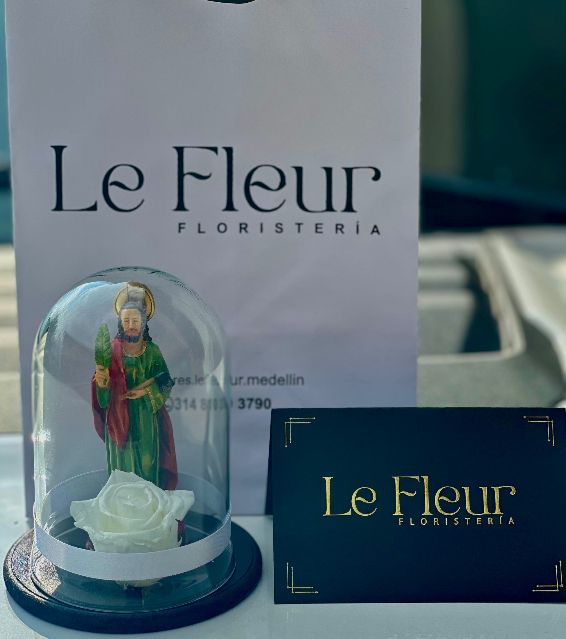 Rosas preservadas premiun con tallo pequeña 🌹 + Santo a color cuentan con base de madera y urna de vidrio con una duración 5 años .