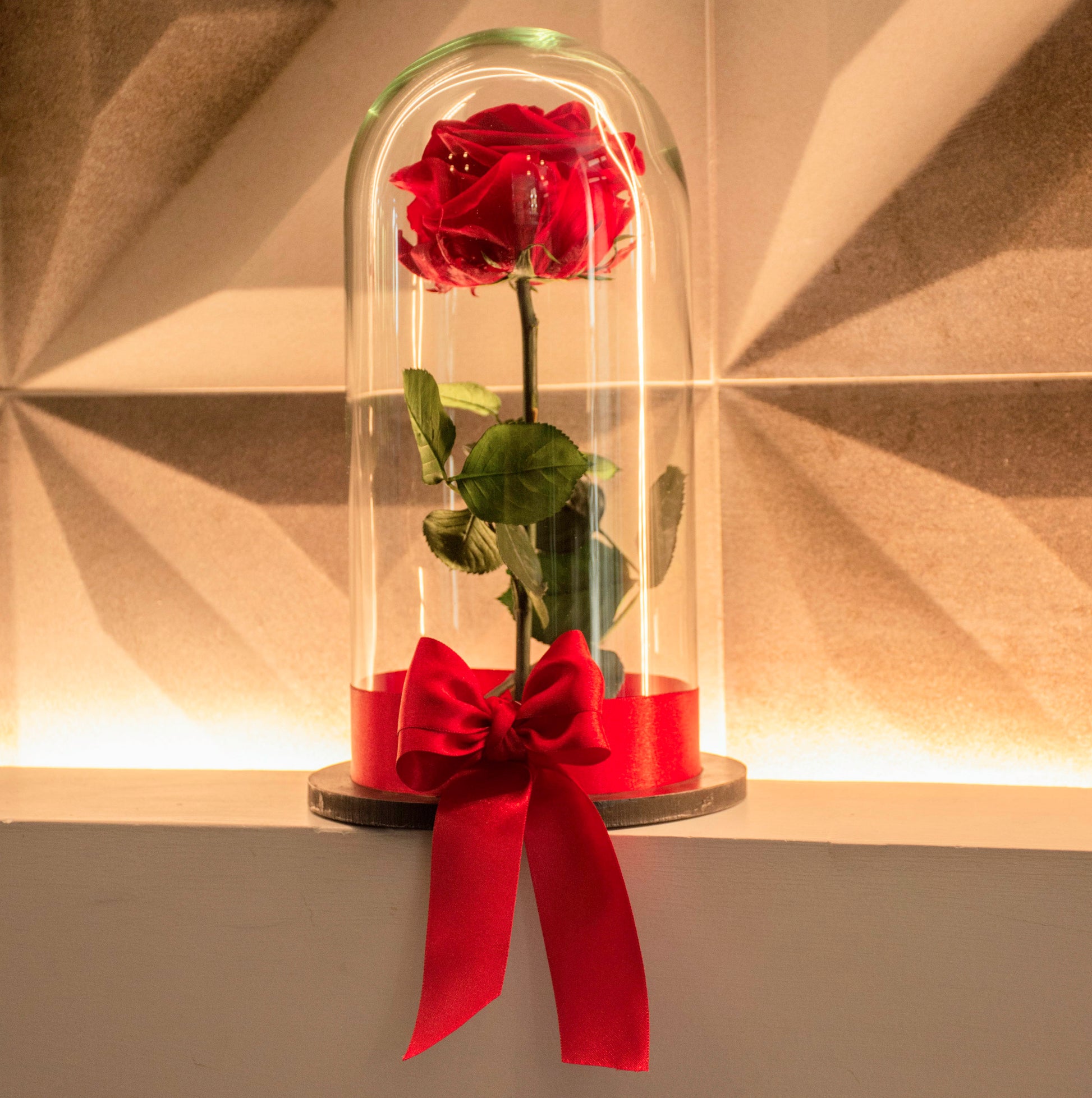 Rosas preservadas premiun con tallo 🌹 cuentan con base de madera y urna de vidrio con una duración 5 años .
